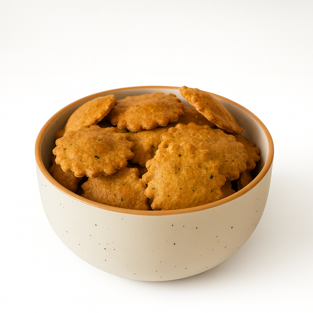Our Whole Wheat Mathari is a baked version of the classic savoury snack—crunchy, flaky, and seasoned with mild spices. Made with 100% whole wheat flour and butter, it brings traditional flavours in a lighter, more modern form.